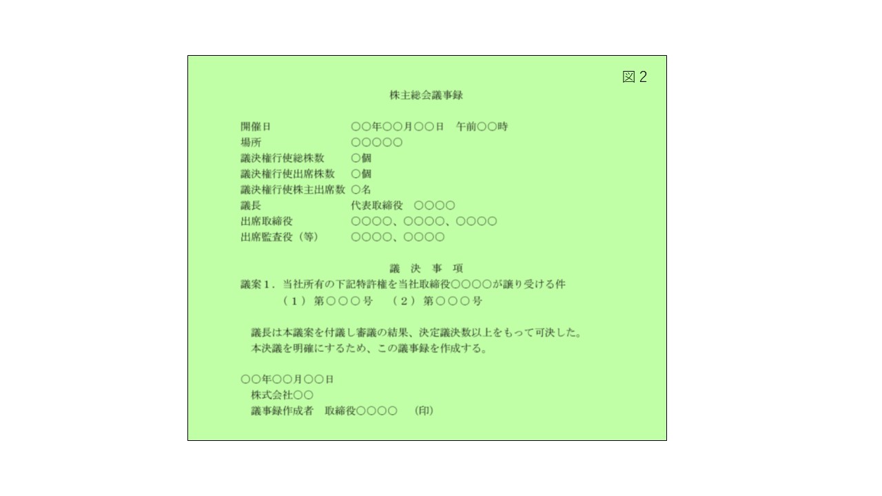 次に「利益相反行為」にあたるか、の確認をします。移転登録申請における「利益相反行為」とは、取締役と会社間の取引制限のことをいいます。取締役が自己の利益を得て、その会社が不利益を被るような取引は問題となるため、その場合は株主総会または取締役会の承認が必要となります。利益相反行為に該当する場合は、議事録(図2)や株主総会または取締役会の承認書、そして登記事項証明書を準備し、移転登録申請書と一緒に提出します(法人の性質により必要書面は異なります)。
