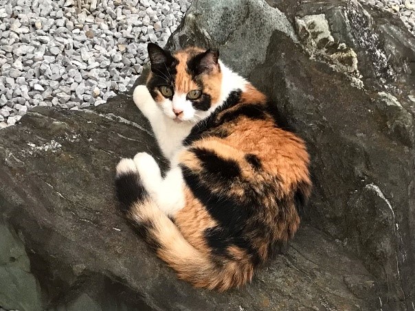 近所にある、小さな川沿いの遊歩道をコースにしています。そこは毎年カルガモが子供を産んで育てていて、カワイイ赤ちゃんの成長を楽しみにしているのですが、暑さのせいか、今年は殆ど見かけませんでした。いつもいる三毛猫さんも、ほぼ毎朝石の上で涼をとっています。